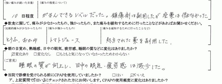 (ご意見)睡眠の質が向上し、日中の眠気・疲労感は減少した。
