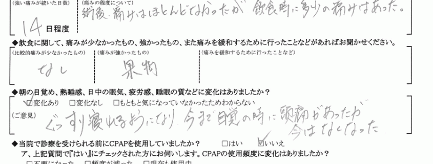 A: (痛みの程度について) 術後痛みはほとんどなかったが、飲食時に多少の痛みはあった。