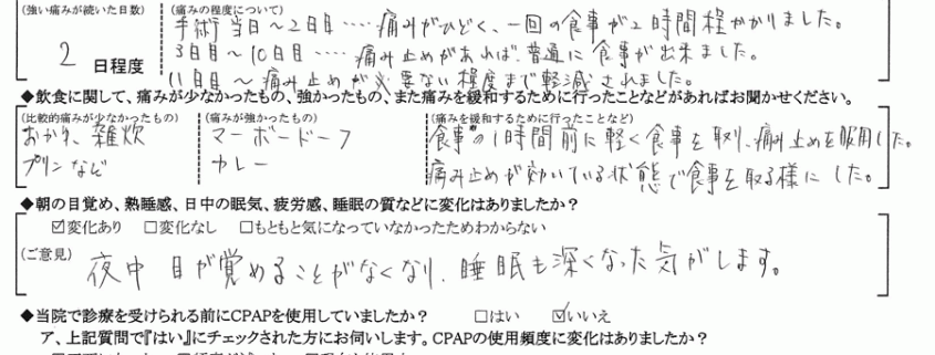 A: (痛みの程度について) 手術当日~2日間…痛みがひどく、一回の食事に2時間程かかりました。
