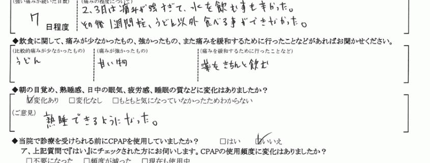 A: (痛みの程度について) 2~3日は痛みが強すぎて、水を飲む事も辛かった。