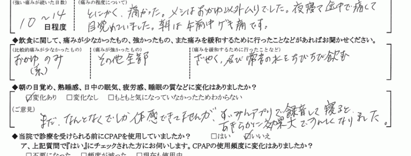 (ご意見) いびきはかなりなくなりましたが、無呼吸はまだあります。(減少はしました。)