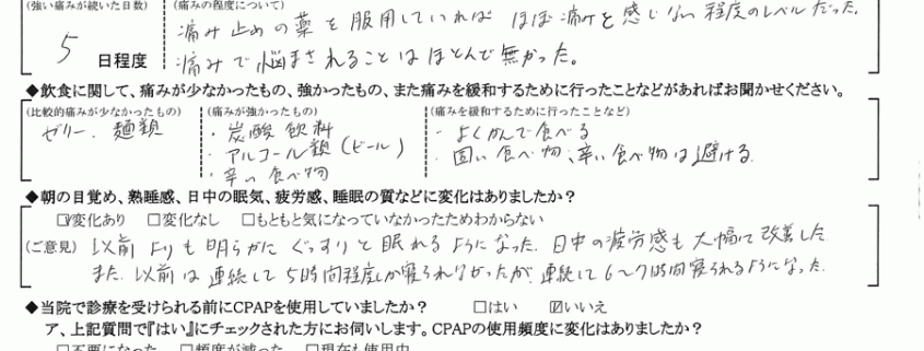 また、以前は連続して5時間程度しか寝られなかったが、連続して6~7時間寝られるようになった。