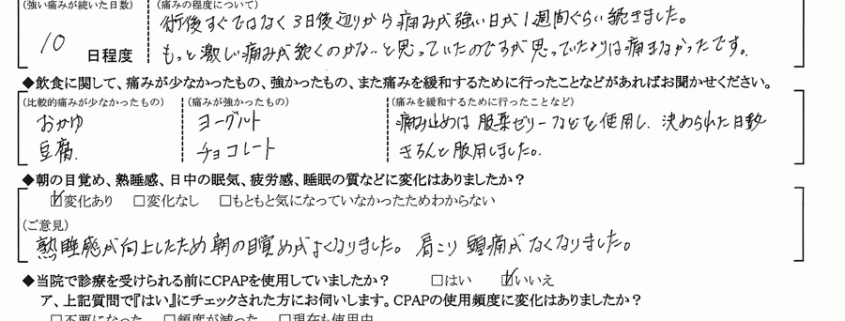 A: (痛みの程度について) 術後すぐではなく3日後辺りから痛みが強い日が1週間ぐらい続きました。