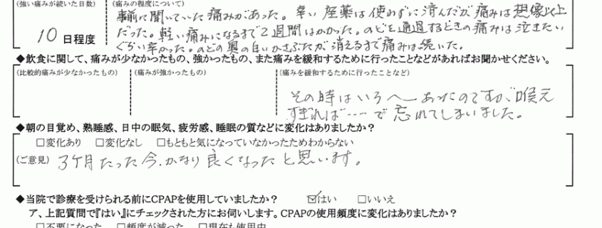 A: (痛みの程度について) 事前に聞いていた痛みがあった。幸い座薬は使わずに済んだが、痛みは想像以上だった。