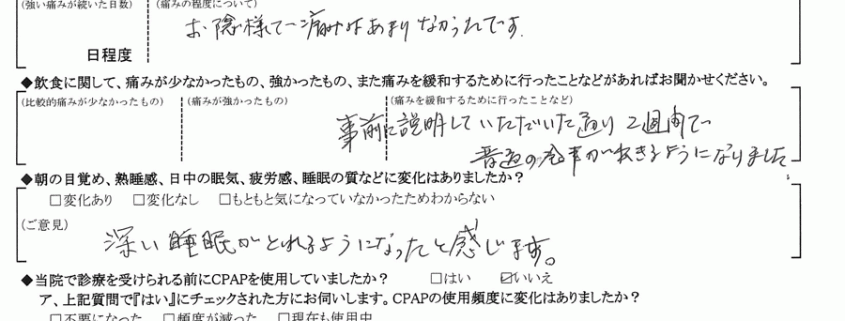 A: (痛みを緩和するために行ったこと) 事前に説明していただいた通り、2週間で普通の食事が出きるようになりました。