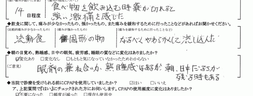 A: (痛みの程度について) 食べ物を飲み込む時、薬が切れると強い激痛を感じた。