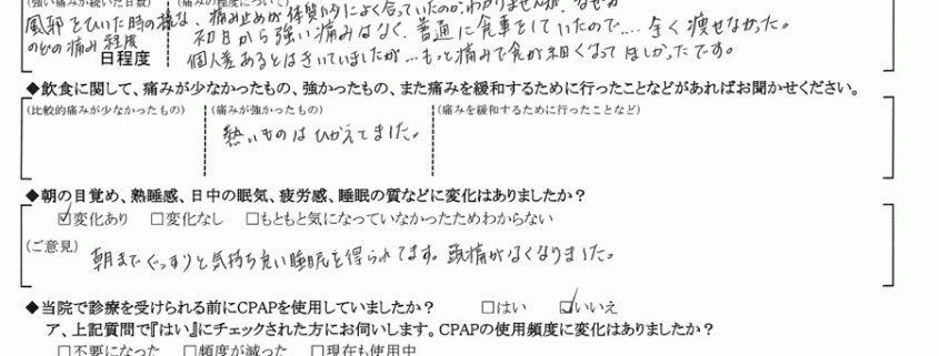 (ご意見) 無呼吸はなくなったが、いびきはわりとそのままかな。むしろ無呼吸がなくなったため、気持ちよくいびきをかいています。