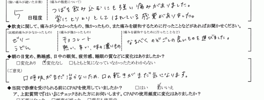 A: (痛みの程度について) つばを飲み込むにも強い痛みがありました。