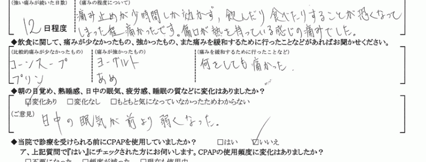 手術自体はとても短時間で済んで仕事に支障を来すこともなく費用も安く助かりました。たった2週間の我慢でいびきの不安から開放されたので、もっと早くこの治療を知って治したかったです。