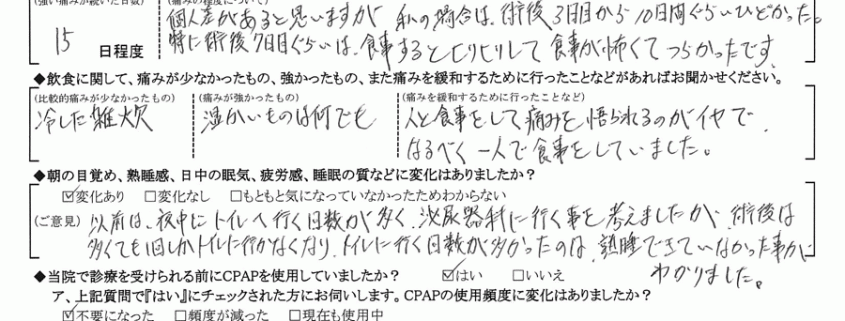 A: (痛みの程度について) 個人差があると思いますが、私の場合は術後3日目から10日目ぐらいひどかった。