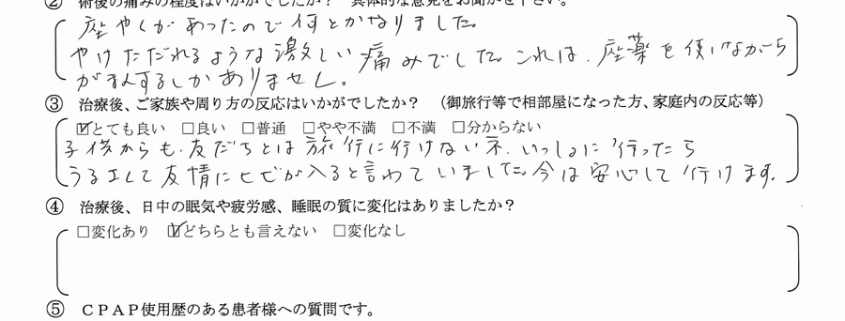 A:1年4か月の間CPAP使用して大変でした。心身ともに開放されました。