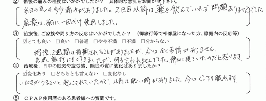 A:ネットなどの口コミで痛みを覚悟していたのですが、個人差があるようで自分はあまり痛みを感じない方だったと思います。いびきもなくなり、手術をして良かったと思っています。