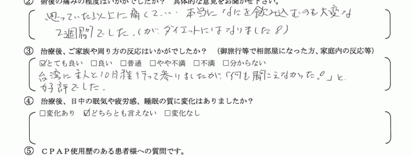 A:ずっといびきで悩んでいたのでインターネットで調べて治療を受けました。術後2週間「こんなに痛くて治ってなかったらどうしよう?」と不安も一杯でしたが、結果は・・・とても満足しております。どうしてもっと早く行かなかったのか!と、今では思っています。ありがとうございました!