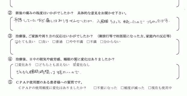 眠りが深くなった、目覚めがよい、無呼吸の状態が以前より短くなった