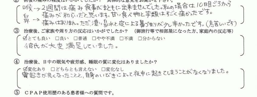 ダウンタイム中の2週間は喉・鼻ともに辛かったですが、スマートフォンのアプリで自身のいびきを録音して確認したら音が無くなっていたので満足しています。