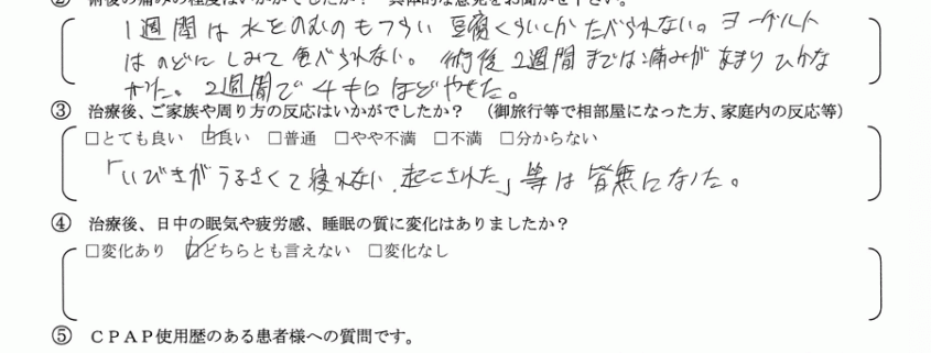 A:術後の痛みはもう味わいたくないが、いびきが治まり、やって良かったと思っています。