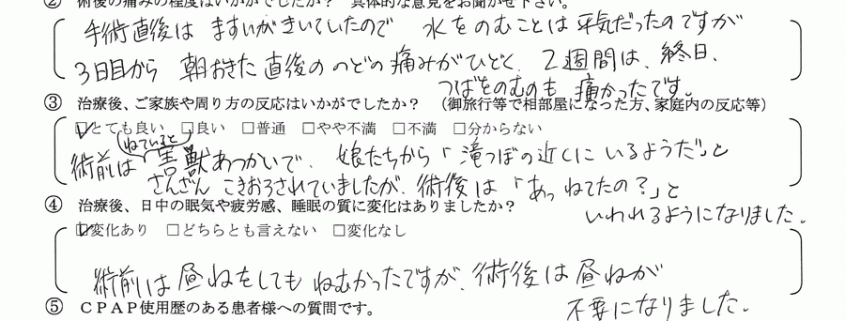 ウ、いびきの音以外で、術後気になる点はございますか?