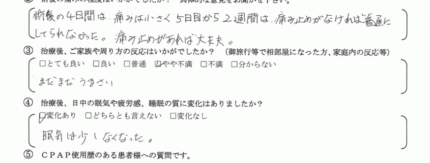 ウ、いびきの音以外で、術後気になる点はございますか?