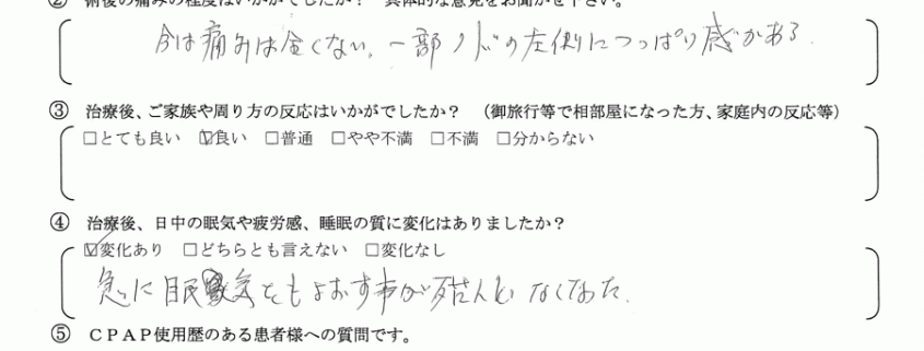 A:無呼吸が完治していない点が残念、との妻のコメント。