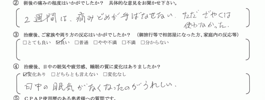 ウ、いびきの音以外で、術後気になる点はございますか?