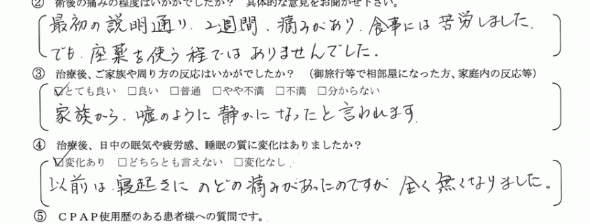 ウ、いびきの音以外で、術後気になる点はございますか?
