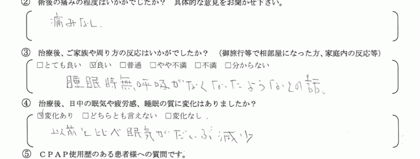 睡眠時無呼吸症候群がなくなったようなとの話。