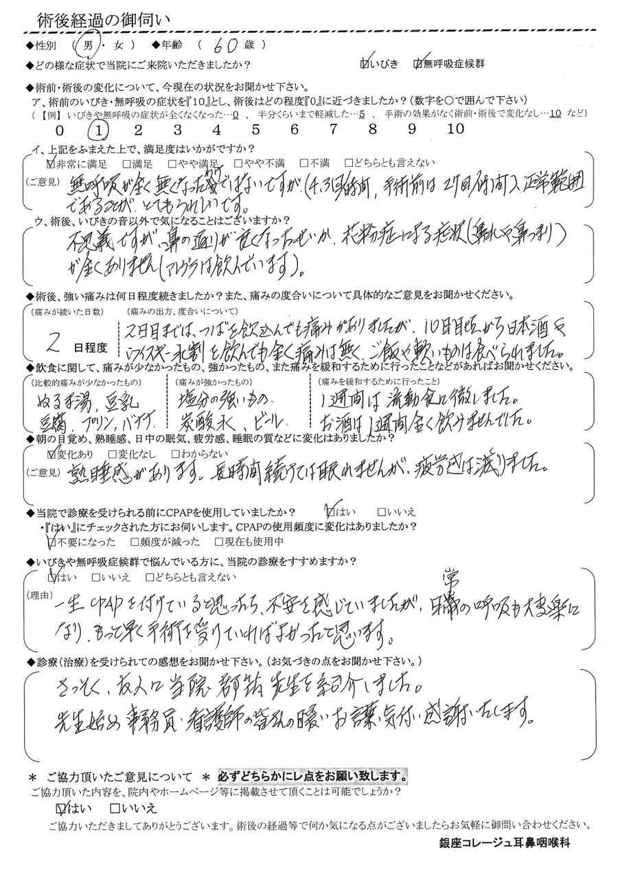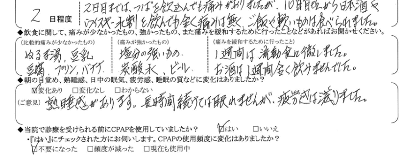(理由) 一生C-PAPをつけて過ごすと思ったら、すごく不安を感じていましたが、日常の呼吸も大変楽になり、もっと早く手術を受けていればよかったと思います。