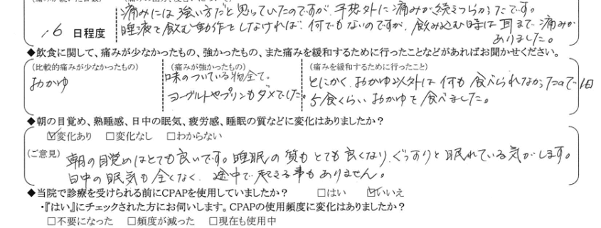 (痛みの程度について) 痛みには強い方だと思っていたのですが、予想外に痛みが続きつらかったです。唾液を飲む動作をしなければ何でもないのですが、飲み込む時は耳まで痛みがありました。