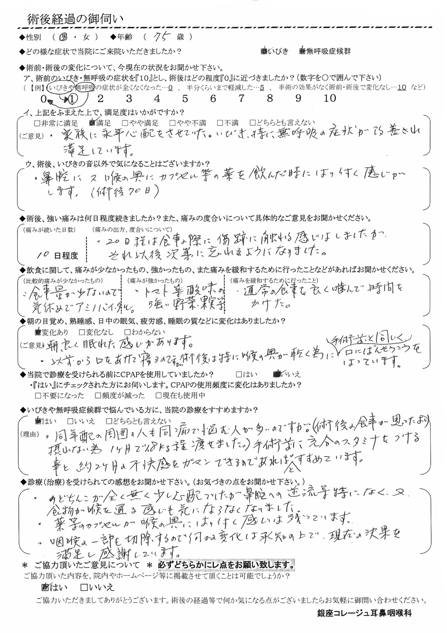 (ご意見) 家族に長年心配させていた。いびき、特に無呼吸の症状が改善され、満足しています。