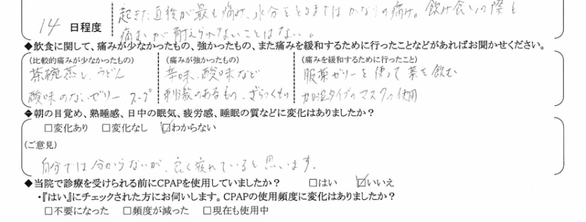 (痛みの程度について) 朝起きた時が最も痛み、水分を取るまではかなりの痛み。飲み食いの際も痛むが、耐えられないことはない。