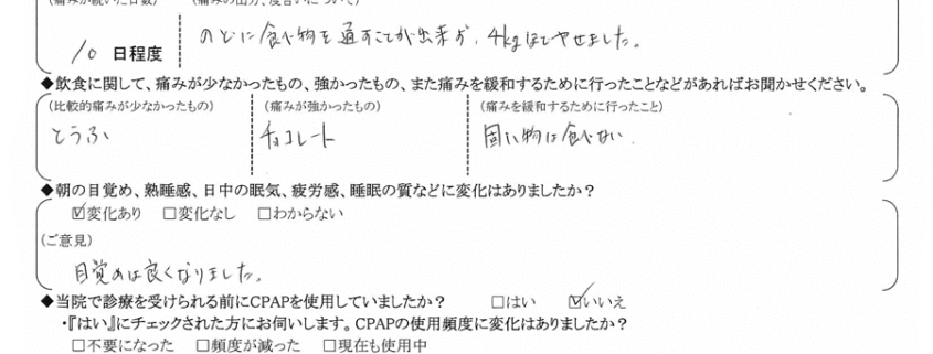 (痛みの程度について) のどに食べ物を通すことができず、4㎏ほどやせました。