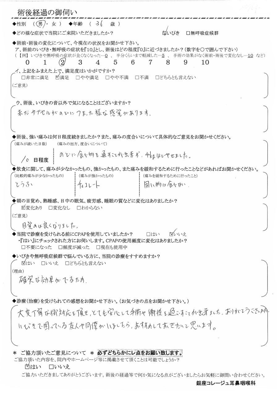 A:大変丁寧な御対応を頂き、とても安心して手術や術後を過ごすことができました。ありがとうございました。いびきで困っている友人や同僚がいましたら、お勧めしておきたいと思います。
