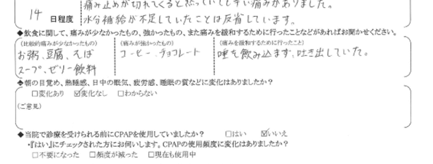 (痛みの程度について) 痛み止めが切れてくると黙っていても辛い痛みがありました。水分補給が不足していたことは反省しています。