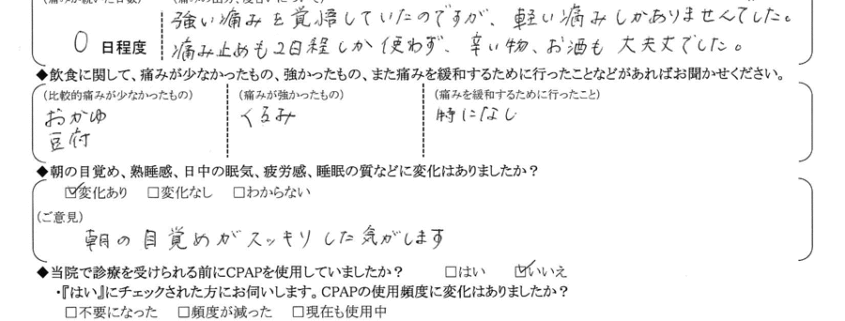 A:とにかく早く手術終えたくて、思い切り口を開けられたのが、術後の痛みも少なくなり、よかったのかと思います。いびきが軽減したのも嬉しいのですが、朝起きるのが楽になったことが一番助かりました。