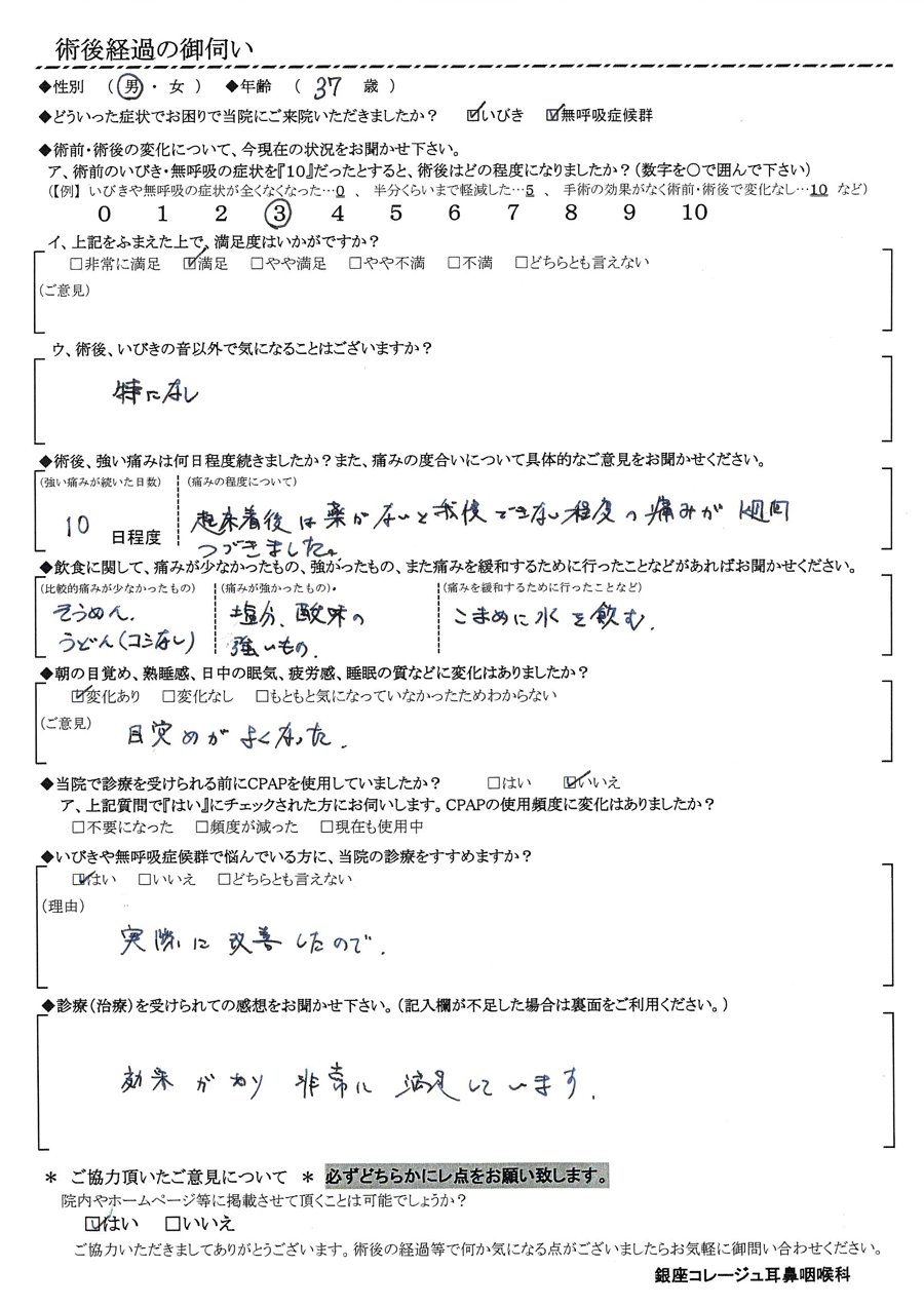 ア, 術前のいびき・無呼吸の症状を『10』だったとすると、術後はどの程度になりましたか? 【3】