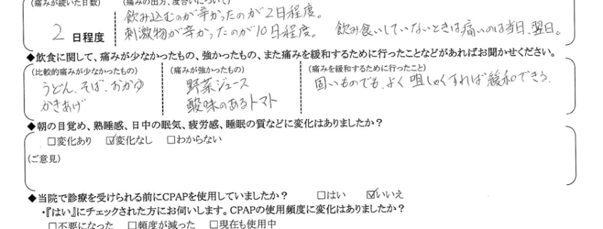 A:(痛みを緩和するために行ったこと) 固い物でもよく咀嚼すれば痛みは緩和できた。