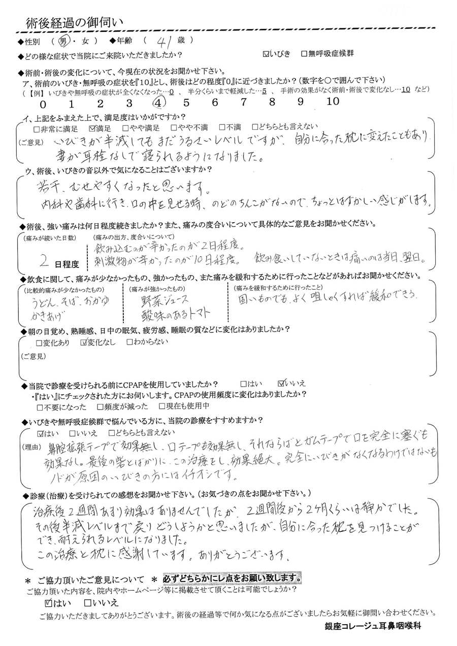 ア, 術前のいびき・無呼吸の症状を『10』だったとすると、術後はどの程度になりましたか? 【4】