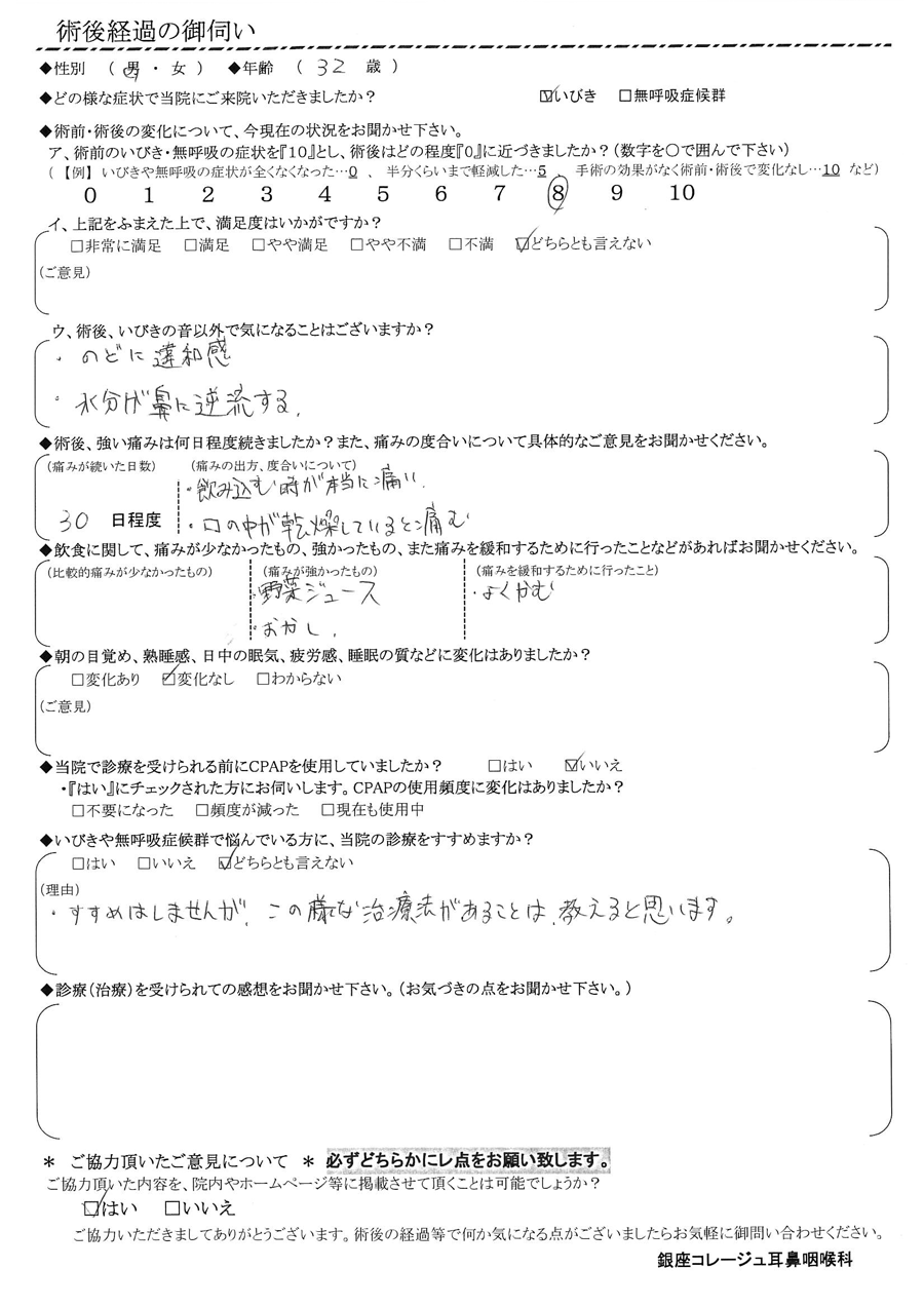 ア, 術前のいびき・無呼吸の症状を『10』だったとすると、術後はどの程度になりましたか? 【8】
