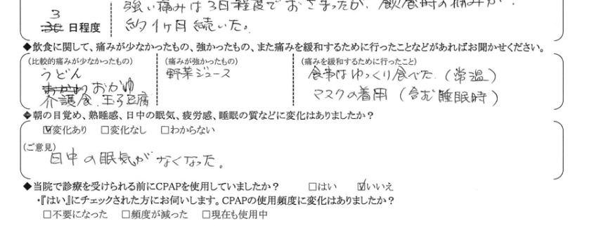 A:(痛みを緩和するために行ったこと) 食事は常温にしてゆっくり食べた。マスクを睡眠時も着用。