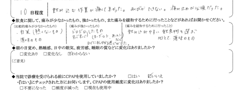 (痛みの程度について) 飲み込む作業が痛くて辛かった。あくびができない。痛み止めが必須だった。