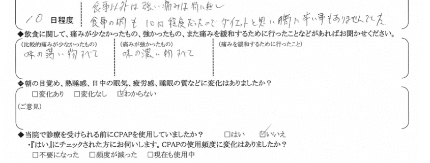 (痛みの程度について) 食事の時以外は強い痛みは特になし。食事の時も10日程度だったので、ダイエットになると考え、特に辛い事もありませんでした。