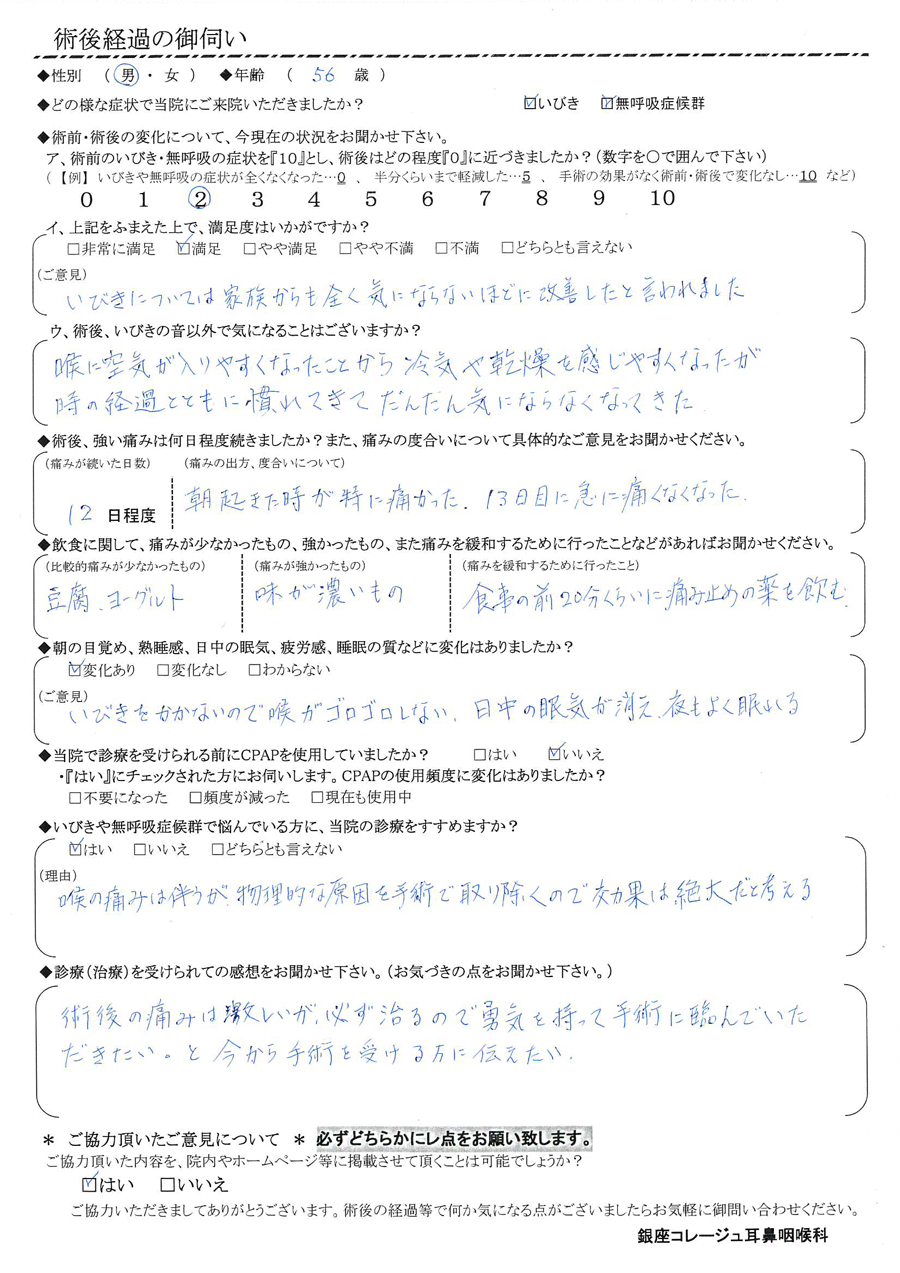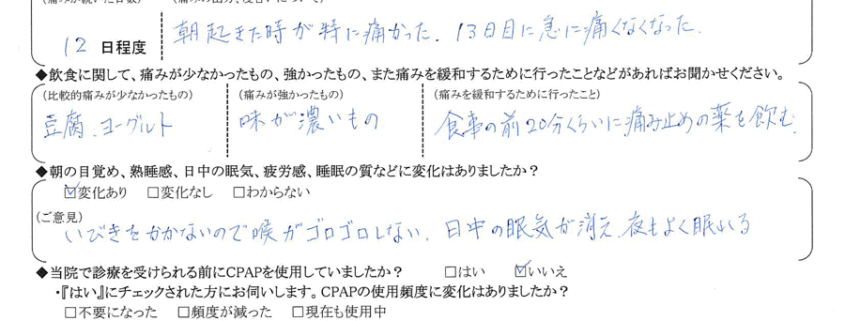 (ご意見) 正直、こんなに効果があるとは思っていませんでした。術後数日はあまり変わらずでしたが、痛みがなくなって来るのと同時に今までとは全然変わり、静かになりました。とても感謝しています。