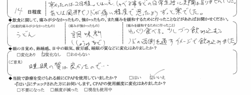 A:(痛みを緩和するために行ったこと)  ゆっくり食べる。少しづづ飲み込む。のどの両側を通すイメージで飲み込みました。