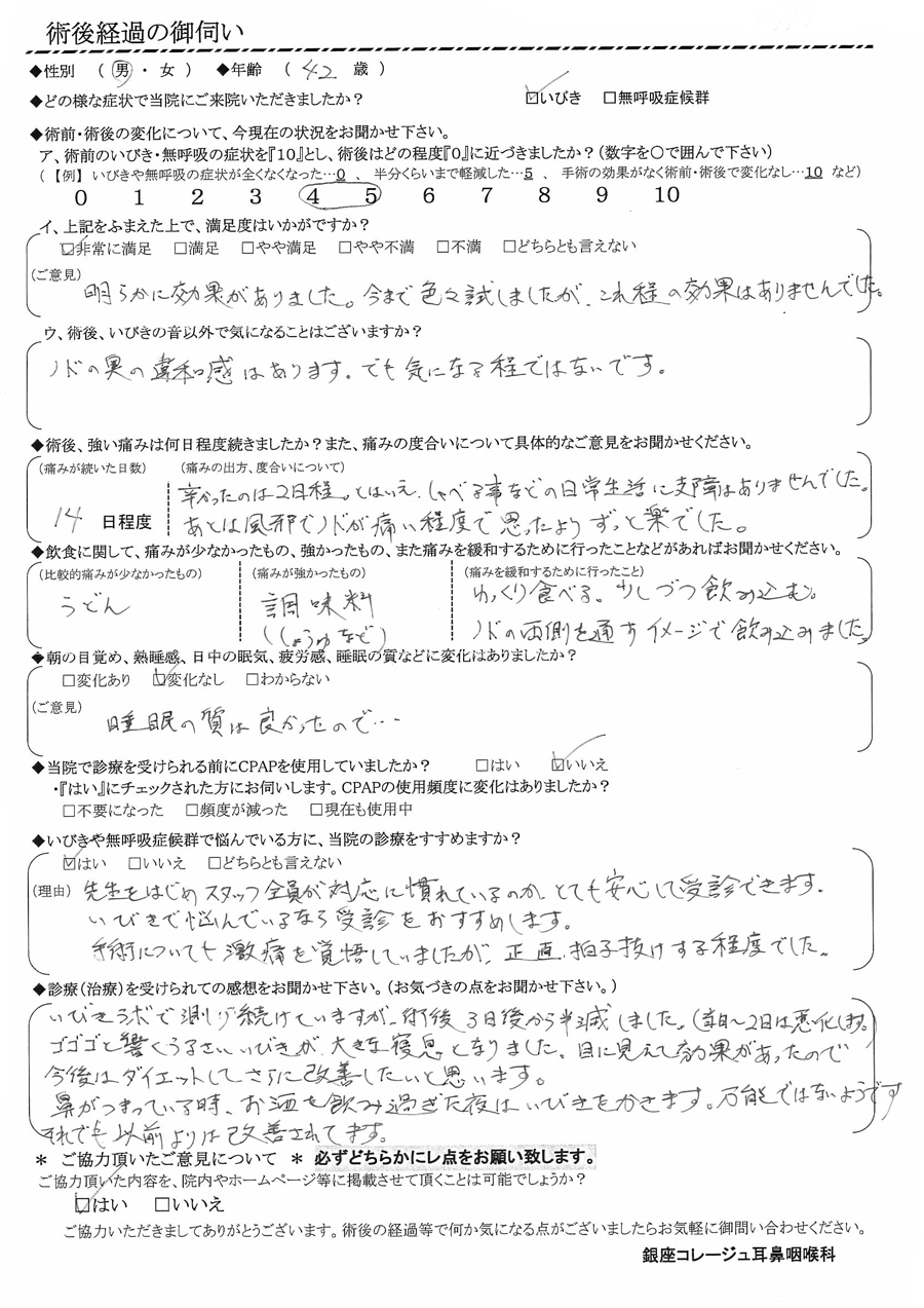A:いびきアプリで測り続けていますが、術後3日後から音が半減しました。(当日~2日は悪化します)