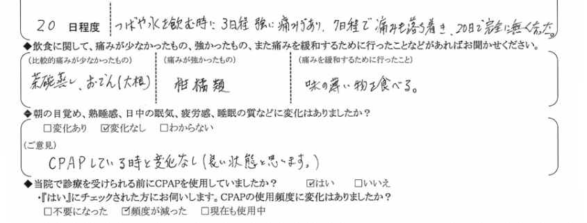 (痛みの程度について) つばや水を飲む時、3日程強い痛みがあり、7日程で痛みも落ち着き、20日で完全に無くなった。
