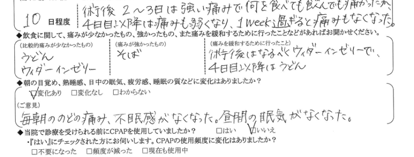 (ご意見)  毎朝ののどの痛み、不眠感がなくなった。昼間の眠気もなくなった。