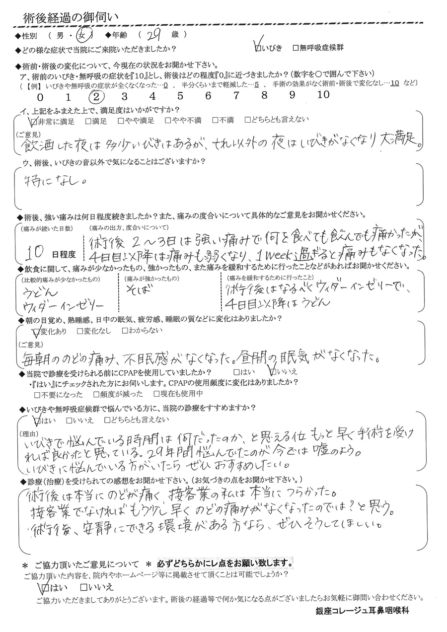(理由)  いびきで悩んでいる時間は何だったのか、と思えるくらい。もっと早く手術を受ければ良かったと思っている。29年間悩んでいたのが今では嘘のよう。いびきで悩んでいる方がいたら是非お勧めしたい。