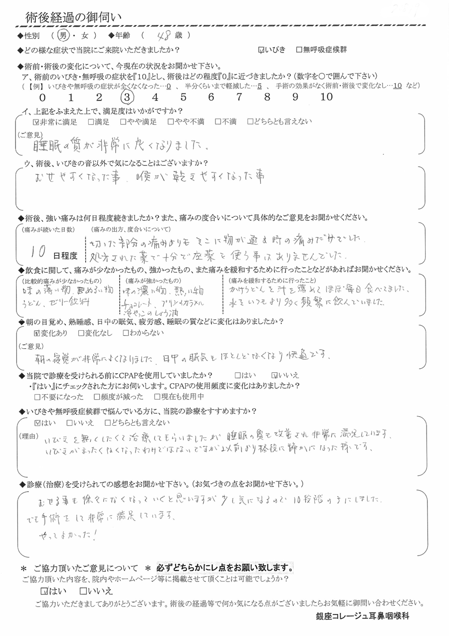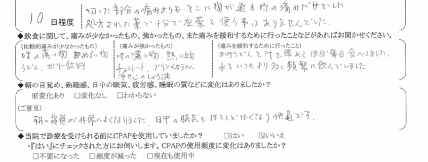 (理由) いびきをなくしたくて治療してもらいましたが、睡眠の質も改善され、非常に満足しています。いびきが全く無くなったわけではないですが、以前より格段に静かになった様です。