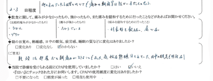 (ご意見) 乾燥した部屋だと朝痛みが生じることもあった。尚、十分な睡眠は取れていた。日中の眠気も特段なし。