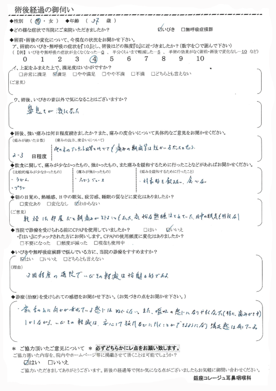 A: 常に舌の上に何かが乗っかっている感じはぬぐえない。また嘔吐の感じになりやすくなった(特に歯磨き時)しかしながらいびきの軽減は、安心して旅行などに行くことができるようになり、満足を感じている。